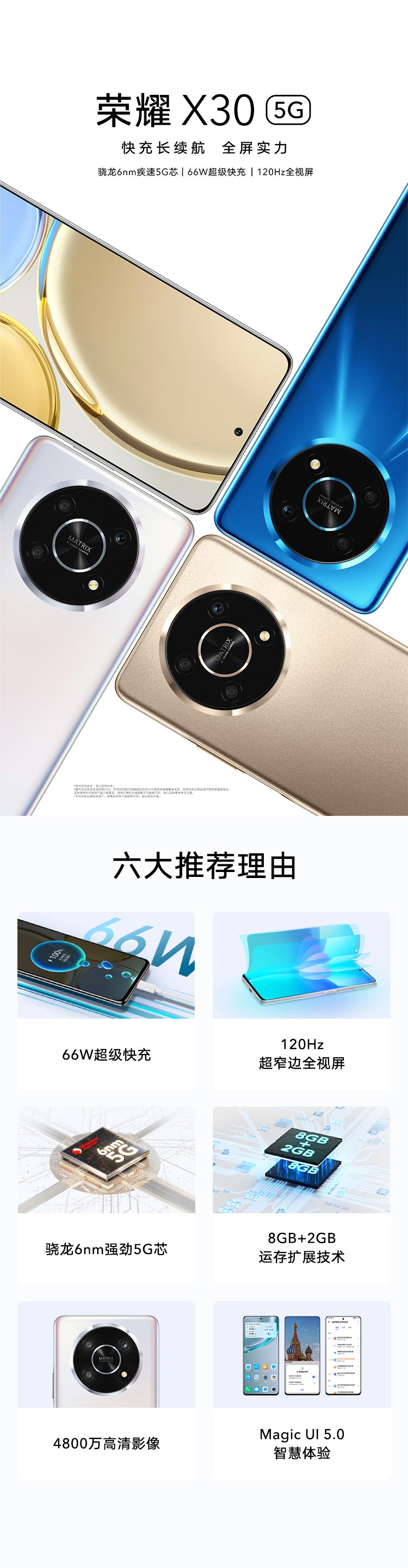 商品名称:荣耀X30 骁龙6nm疾速5G芯 66W超级快充 120Hz全视屏 全网通版 8GB+128GB 钛空银