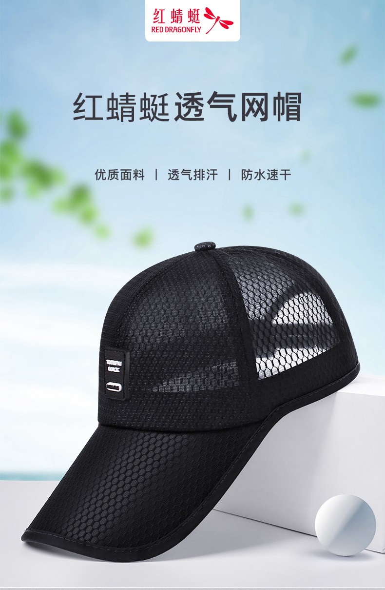 商品名称:红蜻蜓 帽子男夏季遮阳帽户外防晒凉网帽休闲透气太阳帽钓鱼鸭舌帽 10CM加长檐 黑色 男女通用 帽围可调
