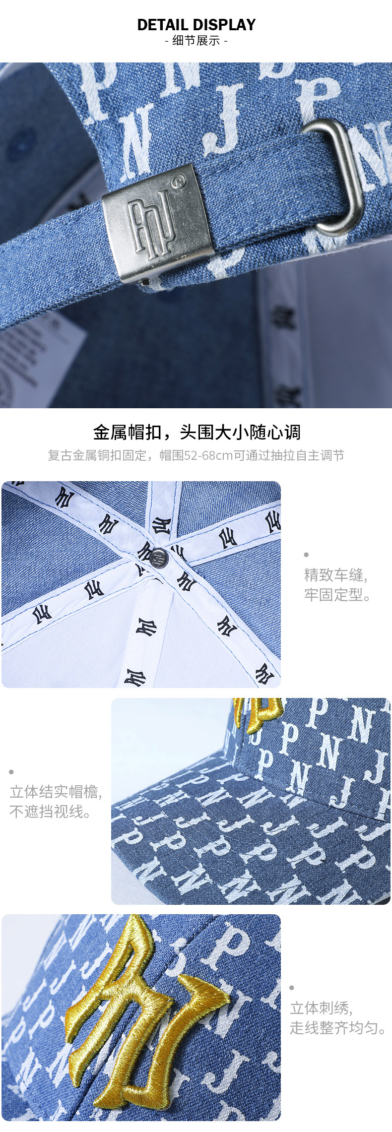 商品名称:PNJ潮牌牛仔蓝棒球帽2022春季新款四季遮阳复古运动情侣鸭舌帽 牛仔蓝/金